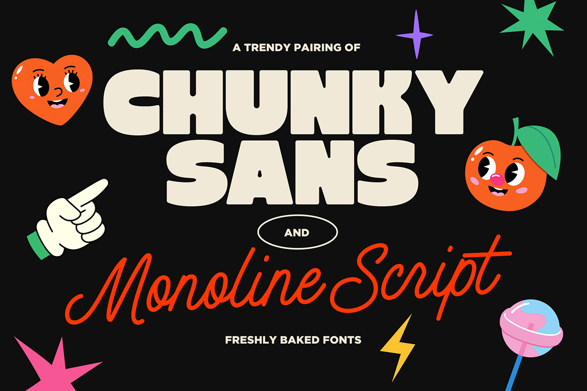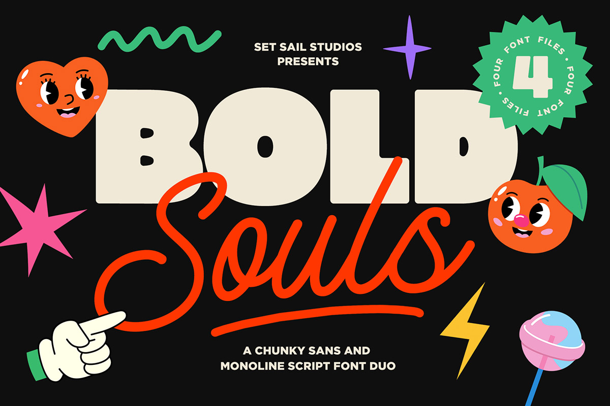 Go Bold with the Bold Souls Font Duo! This trendy pairing of fonts has been carefully designed to perfectly compliment one another, featuring a Super Chunky Sans Font (with the option of sharp or rounded edges), and a Smooth Monoline Script Font (with 35 bonus underline swashes). The strong sans does the heavy lifting while the flowing script gives it the extra flair, both bringing their own unique style to the party.