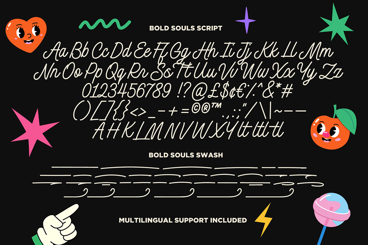 4. Bold Souls Swash • Add a little extra customisation to your ‘Bold Souls Script’ text! Simply install this as it’s own separate font, and type any character (A-Z, g-o) to generate 1 of 35 underline swashes. Swashes A-F are designed to be typed at the end of your ‘Bold Souls Script’ text to join onto your final letter. Swashes G-Z and g-o are designed to be typed on a new layer, and positioned underneath your ‘Bold Souls Script’ text.