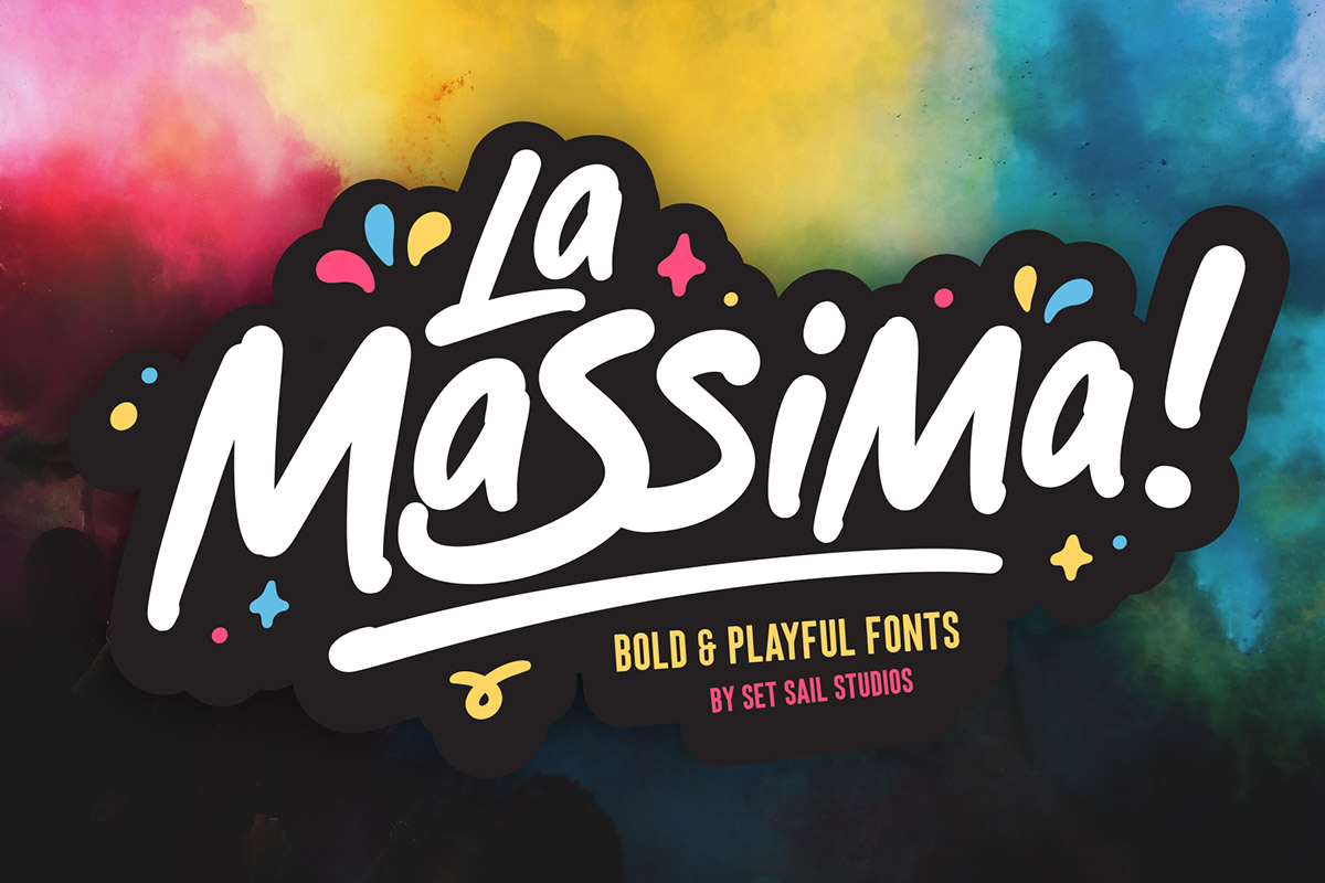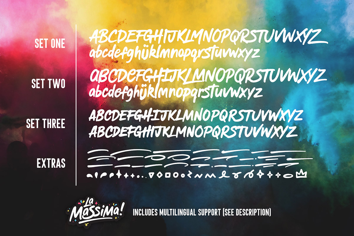 Add some fun energy to your designs with La Massima! A set of 4 bold hand-drawn fonts, designed to create natural, free-flowing and playful typography. Perfect for vibrant branding, product packaging, and head-turning display text. The great thing about this set is how easy it is to create totally custom looking type layouts – this is achieved by having two extra alternate sets of letters beyond the regular font (giving you 6 variations of each letter), as well as a bonus extras font containing 52 playful underline-swashes and doodles. Here’s a closer look at what’s included;