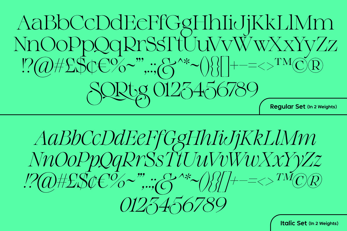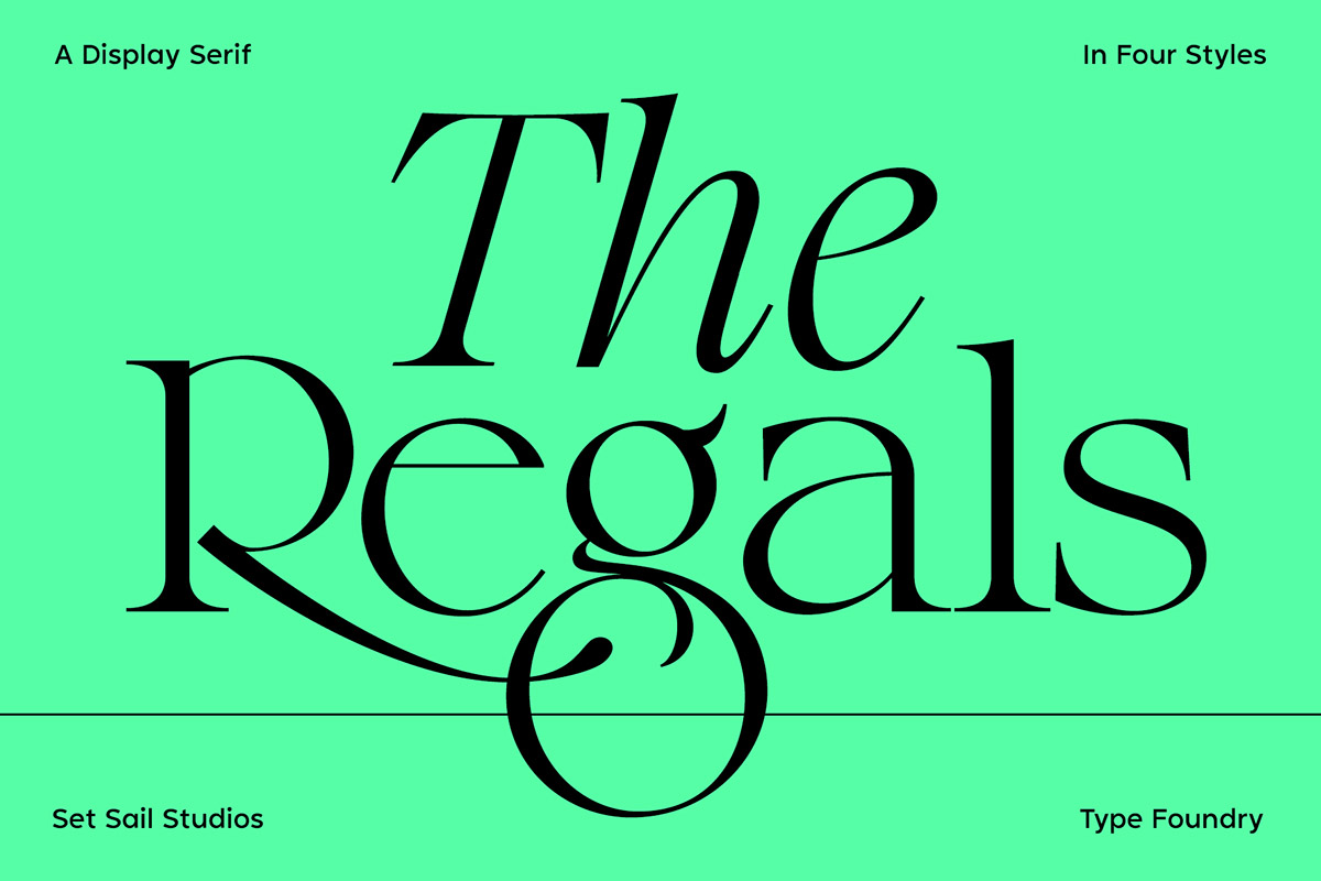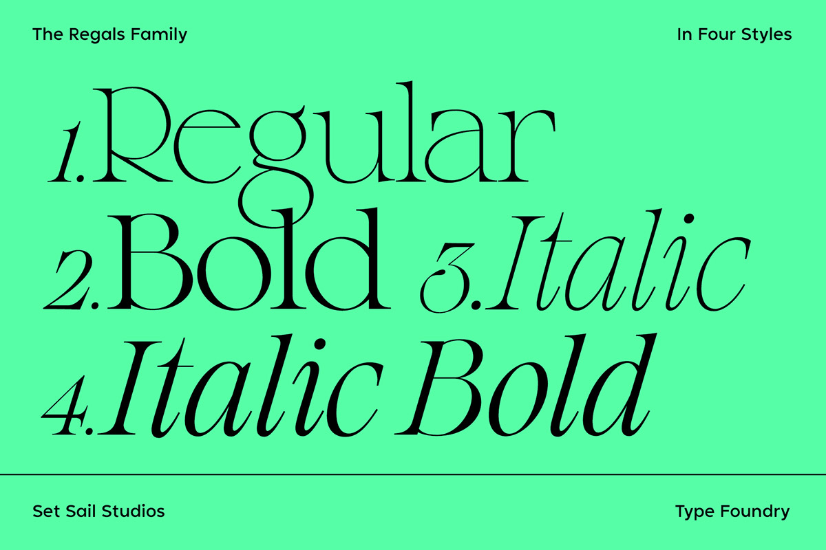 Introducing The Regals Serif Font Family – a crisp, modern spin on a classic transitional serif font. The Regals is a strong & classy display typeface which is highly versatile – offering 4 different styles (Regular, Bold. Italic, Bold italic), as well as a range of ornate alternate and overlapping ligature characters for when you’re in need of a little extra custom flair. Whether it’s stylish headers, elegant logos or timeless quote layouts, The Regals fonts are ready to add sophistication and presence to a range of design projects.